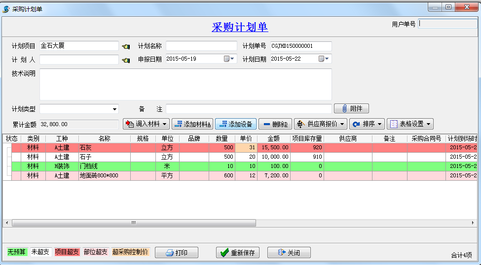 綁定好項目之后,在填寫材料相關(guān)單據(jù)時,會根據(jù)預(yù)算單的價格和數(shù)量進(jìn)行不同顏色的顯示。這里我們以采購計劃單為例進(jìn)行說明。