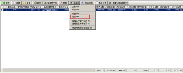 我方要從“保證金管理單位”將投標(biāo)保證金收回。工程管理軟件的項(xiàng)目開拓中選中對應(yīng)的項(xiàng)目,在“保證金”菜單中選擇“收回”,如圖所示: