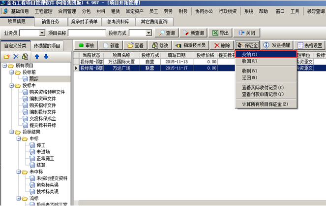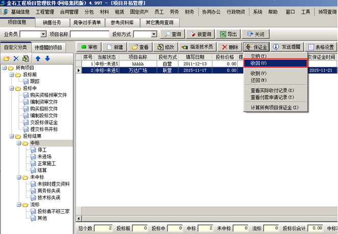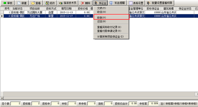 掛靠單位將投標(biāo)保證金交給我方。我方在工程管理軟件的項(xiàng)目開拓列表中找到對應(yīng)項(xiàng)目,在“保證金”菜單中點(diǎn)擊“收到”,如圖: