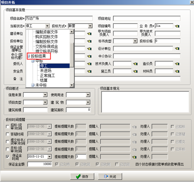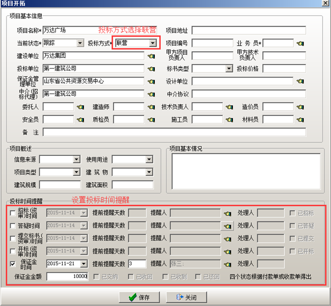 項(xiàng)目狀態(tài)編輯維護(hù)完成之后可在工程管理軟件中建立項(xiàng)目。在工程管理軟件的“項(xiàng)目開拓”中輸入包括個(gè)往來單位以及負(fù)責(zé)人等項(xiàng)目基本信息。也可在投標(biāo)時(shí)間提醒里面設(shè)置“招標(biāo)(資審)時(shí)間”,“答疑時(shí)間”,“提交標(biāo)書時(shí)間”,“開標(biāo)時(shí)間”,“保證金”提醒時(shí)間,時(shí)間設(shè)置完成之后,被提醒的用戶會(huì)在相應(yīng)的時(shí)間收到相關(guān)的提醒內(nèi)容。投標(biāo)保證金,在投標(biāo)保證金對應(yīng)的復(fù)選框打鉤,設(shè)置投標(biāo)保證金的時(shí)間,提前提醒的天數(shù),被提醒人以及金額。如圖所示: