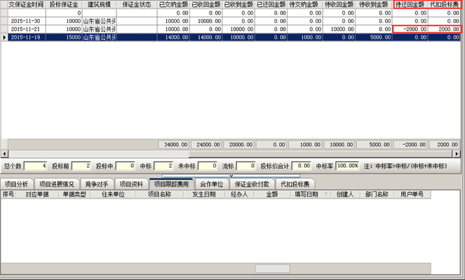 投標(biāo)保證金還回給掛靠單位。項(xiàng)目開拓中會(huì)提示“待還回金額”。如圖所示: