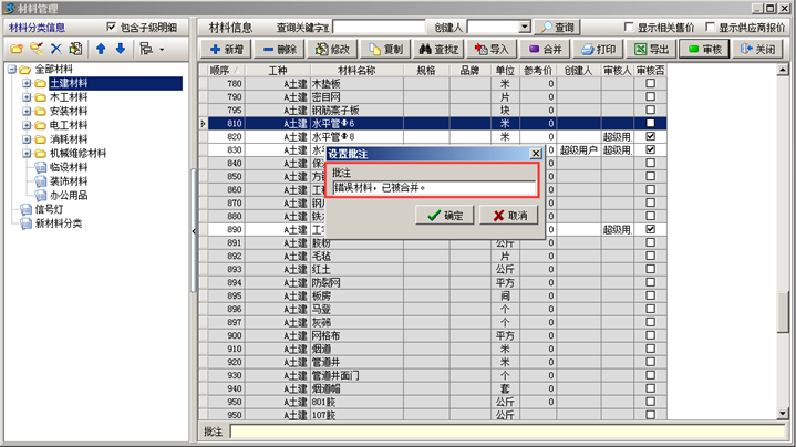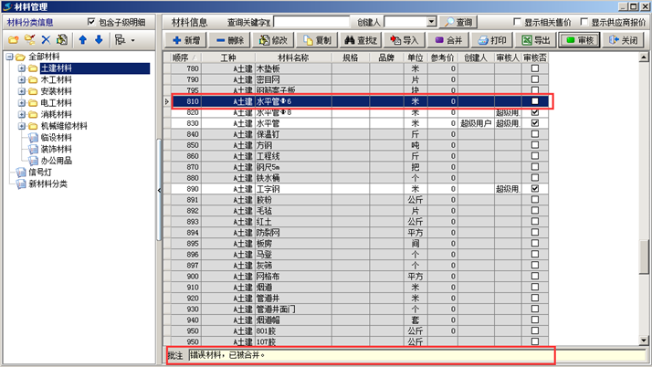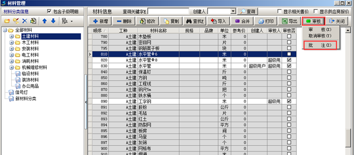 在工地人員使用工程管理軟件錄入業(yè)務(wù)單據(jù)過程中,往往對工程管理軟件的材料庫中維護(hù)員添加的材料不熟悉,已經(jīng)維護(hù)好的材料在工程管理軟件中經(jīng)常找不到,自行添加了材料,但自己添加的材料和維護(hù)員添加的材料名稱差別很大,這樣程序無法識(shí)別是否有重復(fù)。此時(shí)需要讓維護(hù)員利用工程管理軟件的 【審核提醒】+【事后糾正】+【錯(cuò)誤批注】 來在過程中指導(dǎo)工地人員的使用,糾正和統(tǒng)一材料的名稱的叫法。