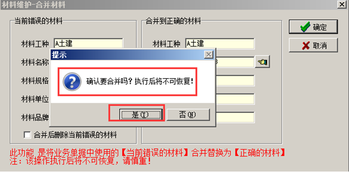 將已經(jīng)存在于工程管理軟件材料庫中的材料進(jìn)行【合并】,選中錯(cuò)誤的材料,點(diǎn)擊“合并”,在彈出的“合并材料”的對話框中選擇正確的材料名稱,所選擇的材料名稱必須是系統(tǒng)中已經(jīng)審核通過的材料。如圖所示: