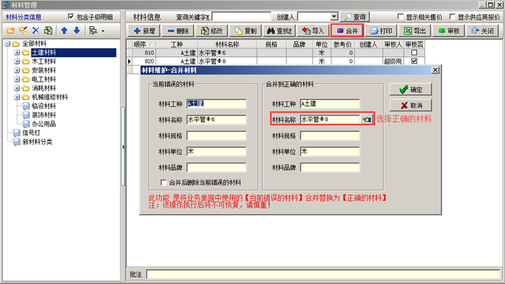 把未審核的材料合并到系統(tǒng)中已經(jīng)存在的材料中(同一種材料,但是材料名稱不一致時(shí)進(jìn)行合并)。