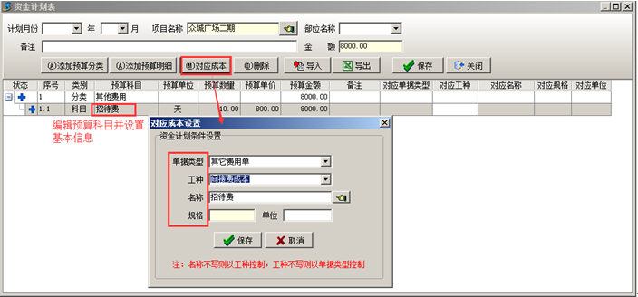 注:在進(jìn)行資金計(jì)劃條件設(shè)置時,如果名稱不填,則以工種控制,如果工種不填則以單據(jù)類型控制。