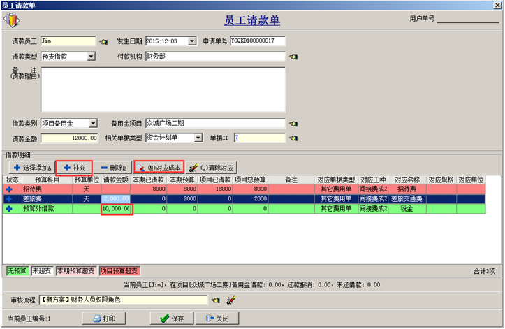 如果需要申請的預(yù)算科目在工程管理軟件的資金計(jì)劃單中沒有設(shè)置,可在“員工請款單中”進(jìn)行補(bǔ)充,點(diǎn)擊“補(bǔ)充”按鈕,對應(yīng)成本并輸入請款金額。在“員工請款單”申請項(xiàng)目備用金時。單據(jù)中補(bǔ)充的無預(yù)算的科目以“預(yù)算外借款”顯示顏色為綠色。如圖: