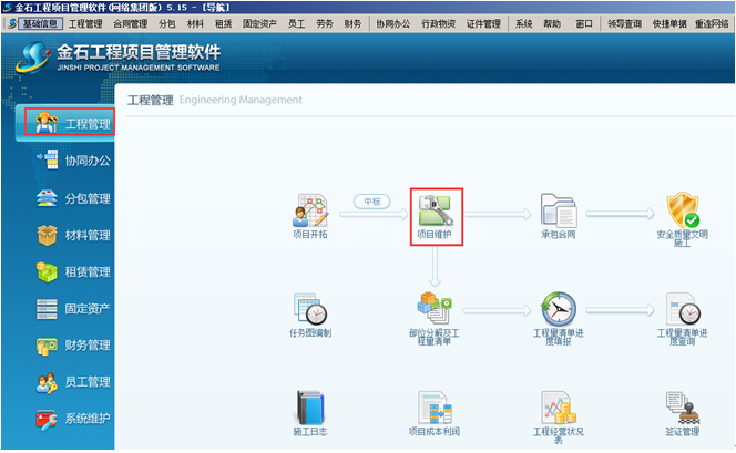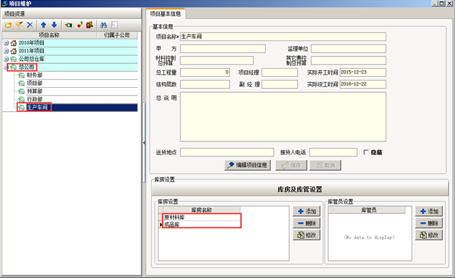 首先在金石工程管理軟件“工程管理”的“項(xiàng)目維護(hù)”中,在公司節(jié)點(diǎn)下建立“生產(chǎn)車間”并設(shè)立對(duì)應(yīng)庫房,這樣便于對(duì)用于生產(chǎn)的原材料或者產(chǎn)品進(jìn)行管理。如圖: