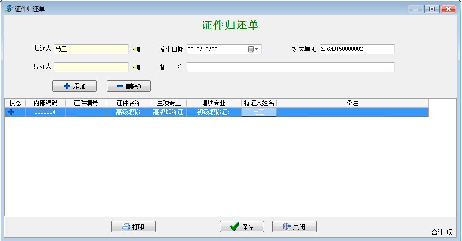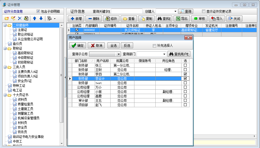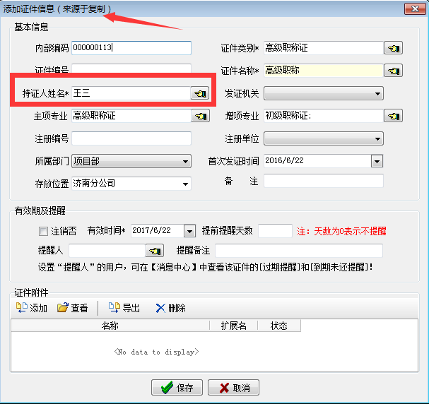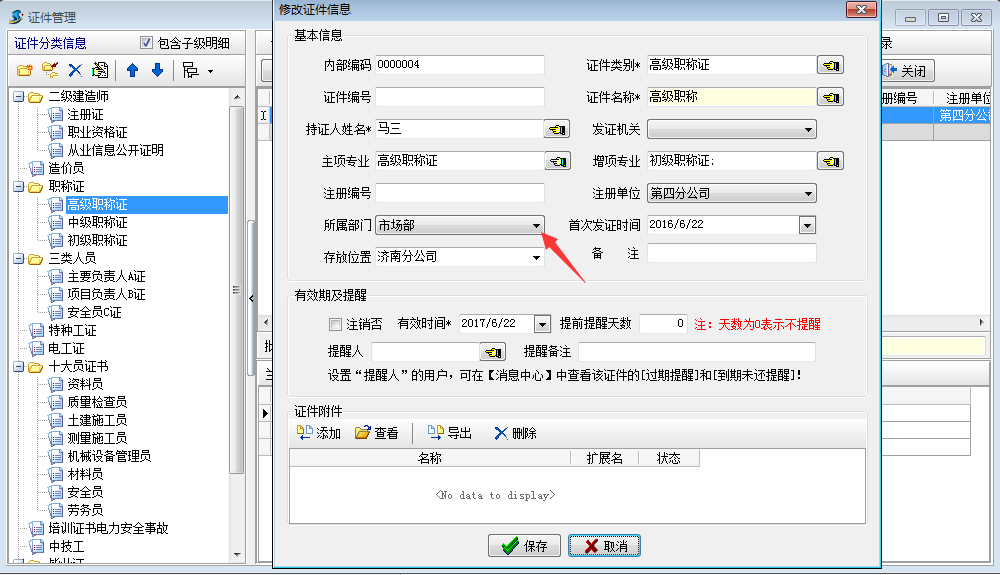 如下圖所示:證件管理的所屬部門已經(jīng)由[項(xiàng)目部]變更為我們剛剛修改的[市場(chǎng)部]了