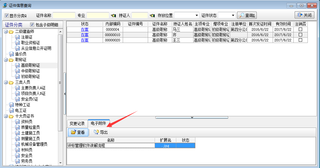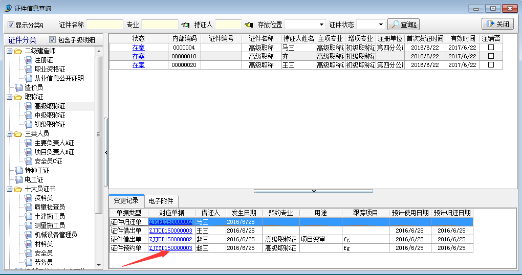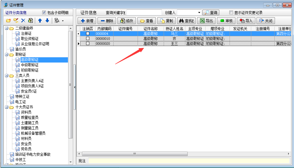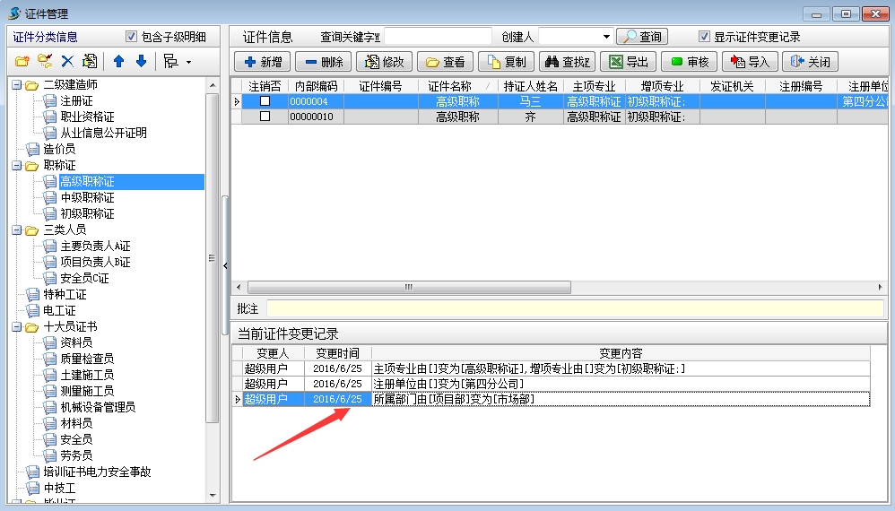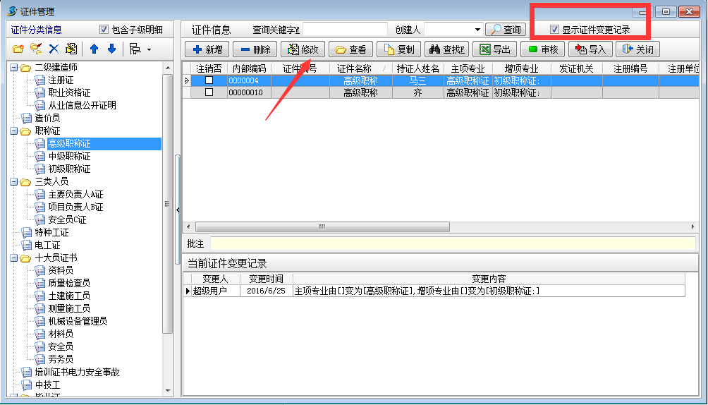 顯示證件變更記錄打勾,選擇修改(主要用于增加證件專業(yè)、所屬部門等信息的變更)