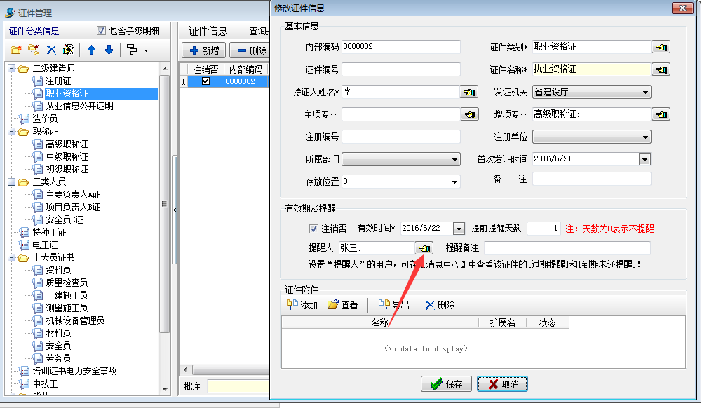 選擇一個(gè)我們已經(jīng)建立好的“二級(jí)建造師”下的“職業(yè)資格證” 選擇提醒人張三和提前提醒天數(shù)、提醒備注等