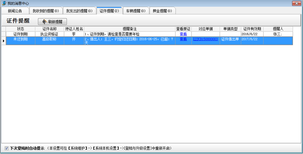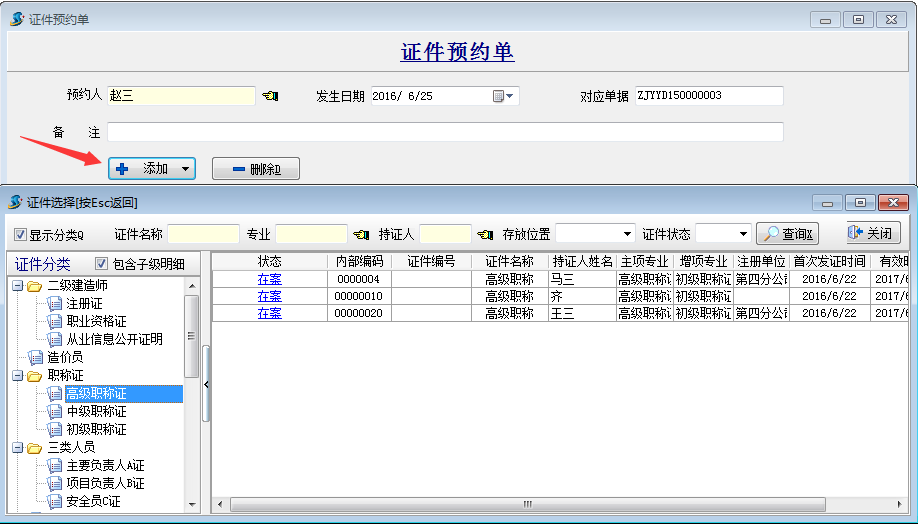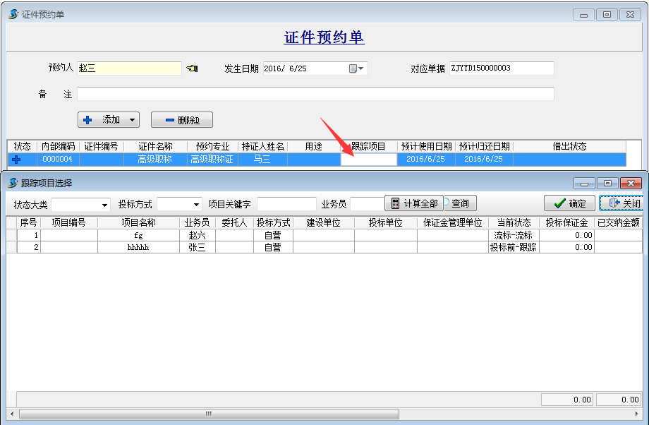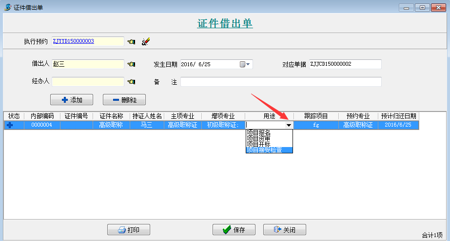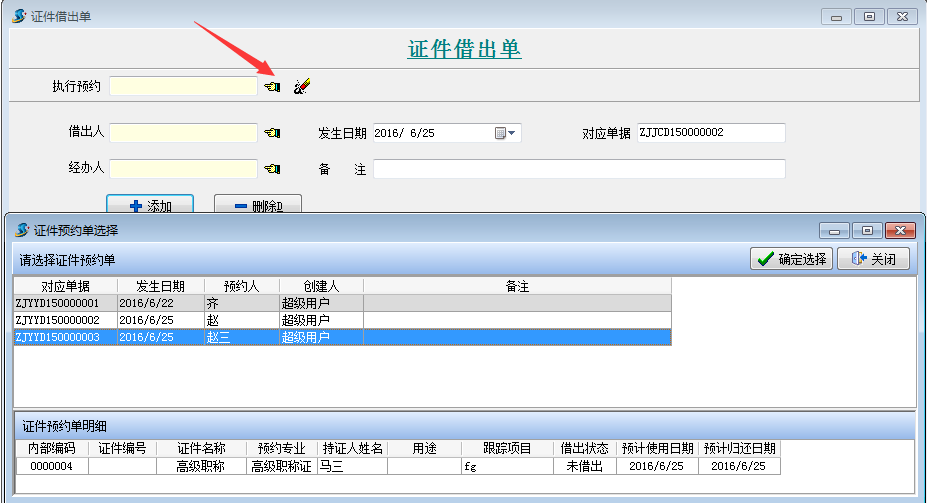 證件借出單可以選擇執(zhí)行我們上一步所演示的預(yù)約和需要跟蹤的項(xiàng)目