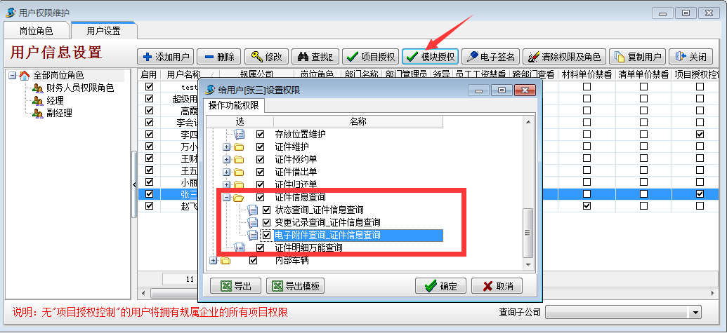 【系統(tǒng)維護(hù)】→【用戶權(quán)限設(shè)置】→【證件信息查詢】選擇下圖內(nèi)容打勾