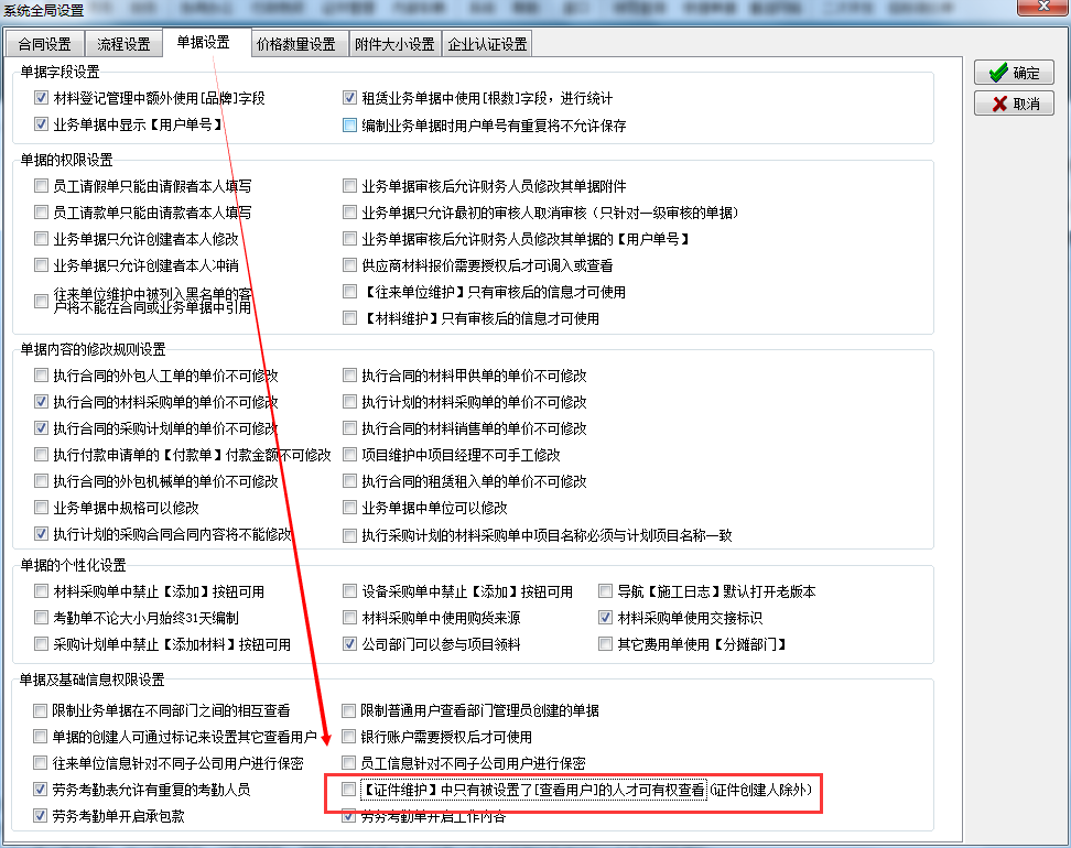 注:如果在【證件維護(hù)】中新建的證件不想設(shè)置【查看用戶】默認(rèn)讓所有人看到,可以到【系統(tǒng)維護(hù)】->【系統(tǒng)全局設(shè)置】->【單據(jù)設(shè)置】中,把如下圖的開關(guān)去掉!