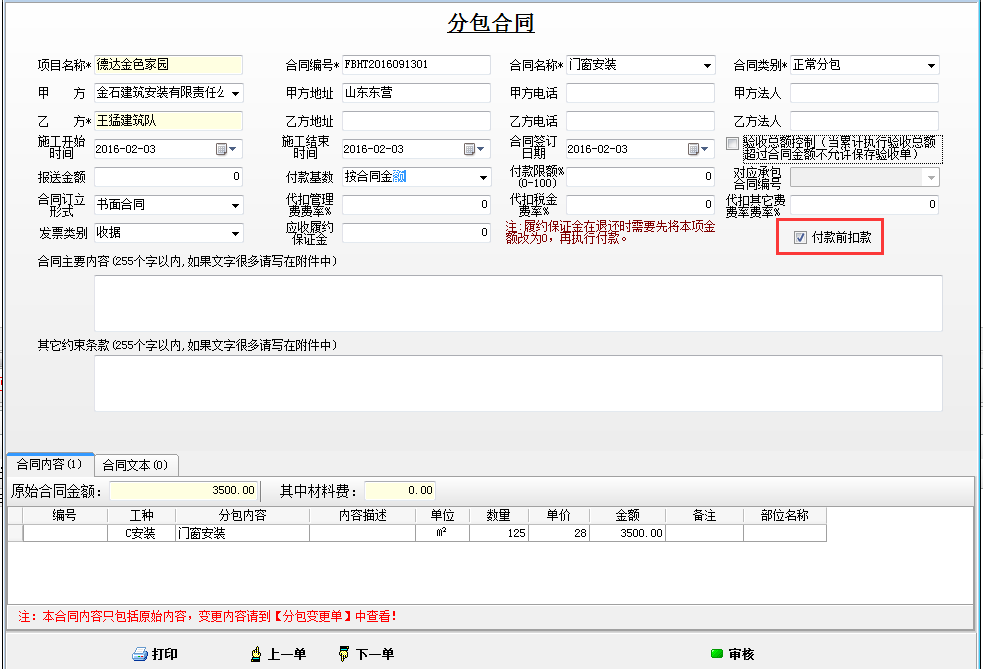 新建分包合同時(shí)在“付款前扣款”處打鉤。如下圖: