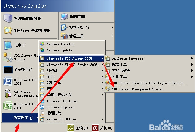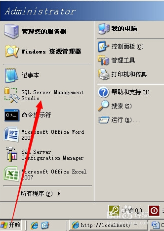 1、在開始菜單中單擊SQL Server Management Studio,啟動數(shù)據(jù)庫。如果沒看到SQL Server Management Studio,可以在所有程序找到SqlServer2005