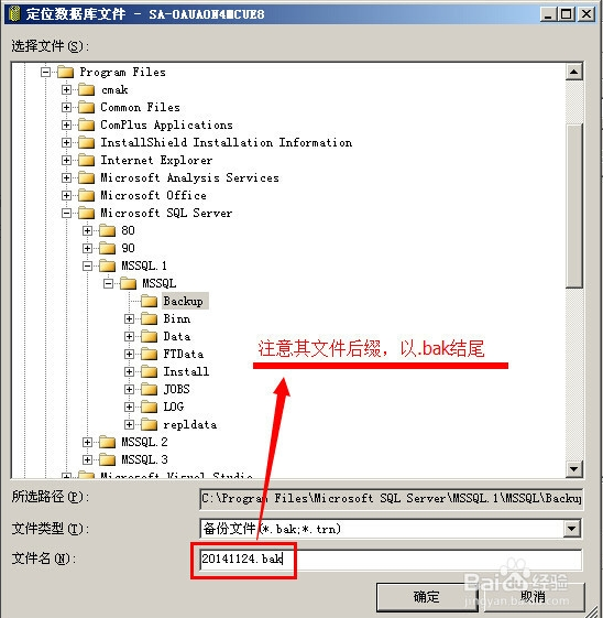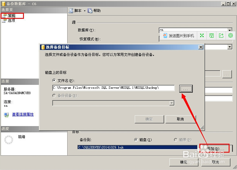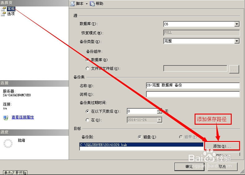4、彈出備份數(shù)據(jù)庫窗口,在常規(guī)中設(shè)置保存路徑,步驟為首先點(diǎn)擊左邊的常規(guī),然后點(diǎn)擊添加,在彈出框中點(diǎn)擊省略號選擇文件的保存,后綴名稱為.bak,填寫完成之后,點(diǎn)擊確定