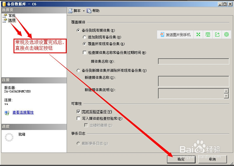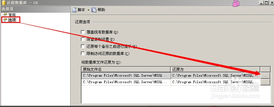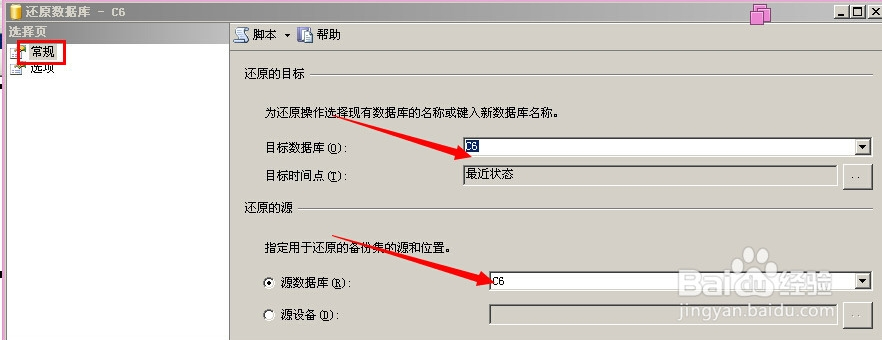 6、彈出還原數(shù)據(jù)庫窗口,在常規(guī)中檢查目標(biāo)數(shù)據(jù)庫名稱與源數(shù)據(jù)庫名稱是否正確、在選項(xiàng)中找到備份的數(shù)據(jù)庫文件