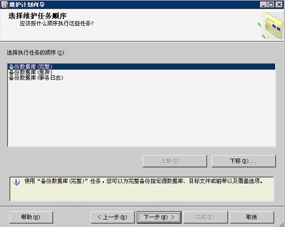 8、點(diǎn)擊【下一步】按鈕:彈出以下【選擇維護(hù)任務(wù)順序】對話框,如果有多個維護(hù)任務(wù),在此可以通過【上移】和【下移】兩個按鈕來設(shè)置維護(hù)任務(wù)的順序,設(shè)置完畢后單擊【下一步】按鈕。