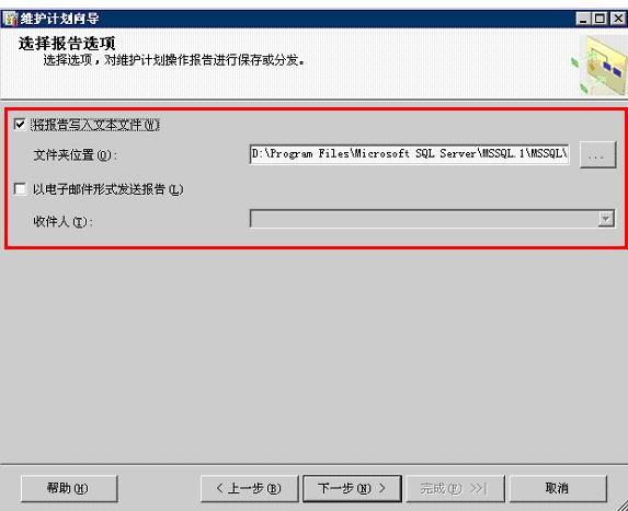 10、彈出【選擇報告選項(xiàng)】對話框,在該對話框里可以選擇如何管理維護(hù)計(jì)劃報告:可以將報告寫入文件中,或通過電子郵件發(fā)送數(shù)據(jù)庫管理員。設(shè)置完畢后單擊【下一步】按鈕。