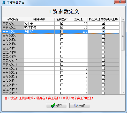填寫(xiě)科目名稱(chēng)和默認(rèn)值,是否顯示打勾,是否將默認(rèn)值替換到員工庫(kù)