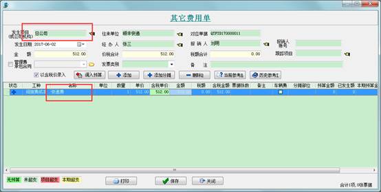 發(fā)生的項目我們選擇總公司,費用名稱為快遞費(可以事先在費用科目維護里設置好)。