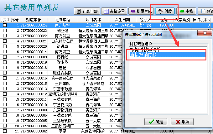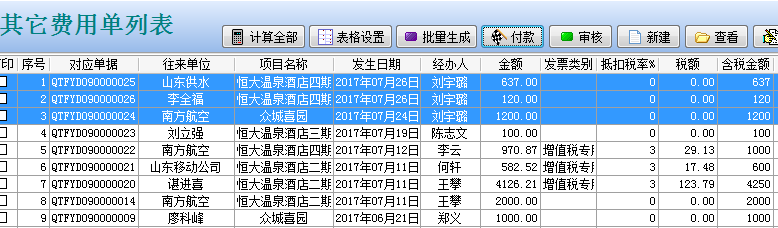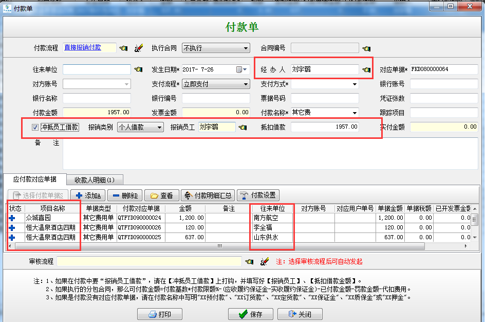 在工程項目管理軟件中如果某個員工在多個項目任職,又有多個往來單位都產(chǎn)生業(yè)務(wù)往來,都要進行報銷付款(沒有對應(yīng)合同的前提下),按住ctrl鍵選擇待付款的單據(jù)(需單據(jù)的經(jīng)辦人是相同的)