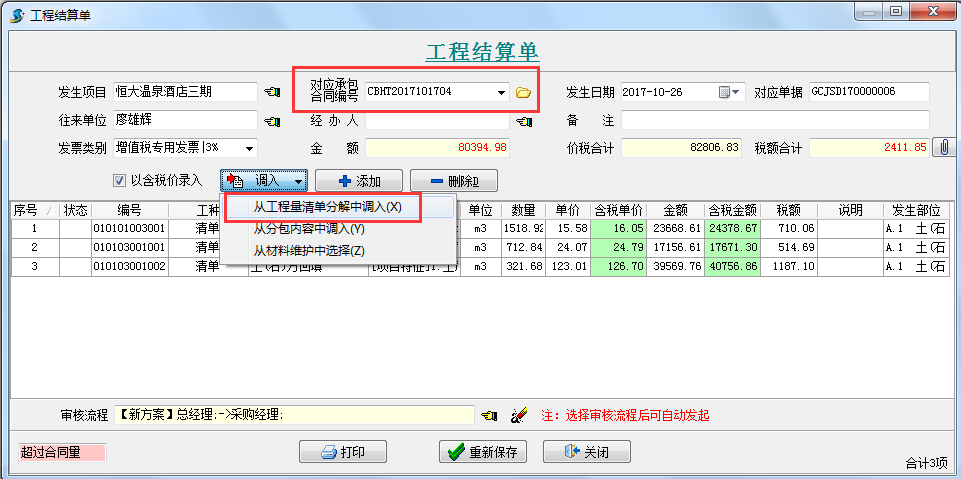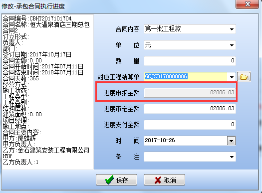四、填寫(xiě)“承包合同”執(zhí)行進(jìn)度,對(duì)應(yīng)工程結(jié)算清單,(下圖)“進(jìn)度申報(bào)金額”就是在工程結(jié)算單中填寫(xiě)的暫估收款金額,“進(jìn)度審定金額”就是報(bào)給甲方審定后的最終收入金額