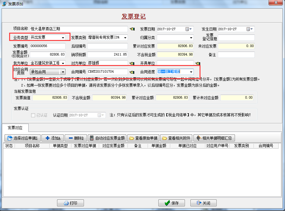 發(fā)票登記有多處需要注意,“業(yè)務(wù)類型”為開(kāi)出發(fā)票(銷(xiāo)項(xiàng)稅),對(duì)應(yīng)“承包合同”、“合同編號(hào)”和“合同進(jìn)度”。