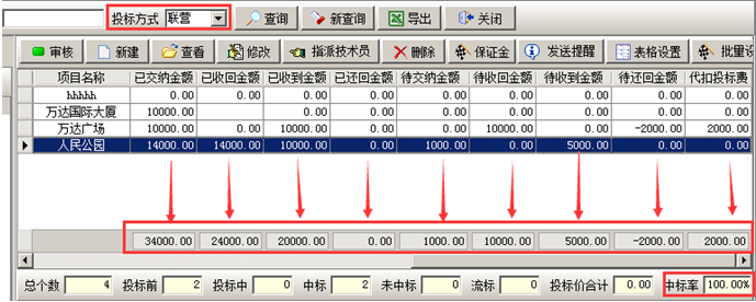 在工程管理軟件項(xiàng)目開拓列表中可以查詢多個(gè)項(xiàng)目投標(biāo)保證金的九項(xiàng)合計(jì),如圖所示:也可根據(jù)投標(biāo)方式、業(yè)務(wù)員、項(xiàng)目狀態(tài)查詢。