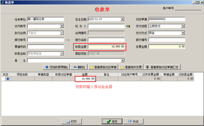 點(diǎn)擊“收到”,填寫收款單,輸入好保證金的金額,如圖: