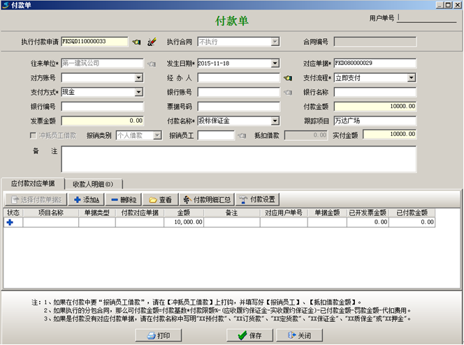 交納投標(biāo)保證金時(shí)填寫“付款申請單”或者“付款單”,(如果填寫的是付款申請單則在付款申請單審核通過之后進(jìn)行付款),如圖: