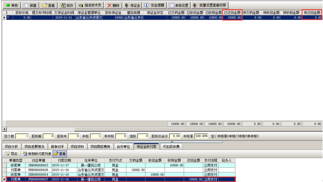 收款完成,工程管理軟件中會(huì)顯示已收到金額以及投標(biāo)保證金的收付款記錄。如圖所示: