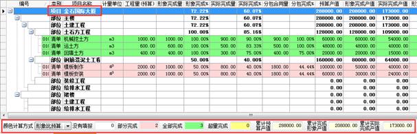 對于某些工程,高水平的項目經(jīng)理可以把實(shí)際完成量做小,需要的達(dá)到的效果是“實(shí)際干的進(jìn)度小于向甲方上報的進(jìn)度”。在金石軟件中能很好地體現(xiàn)“實(shí)際進(jìn)度”、“形象進(jìn)度”兩個概念,在進(jìn)度填報過程中可以將“實(shí)際進(jìn)度”、“形象進(jìn)度”分別填報。并且將清單“甲方合同量”、“分包合同量”、“形象完成量”、“實(shí)際完成量”四者的關(guān)系完全展現(xiàn)在一起。