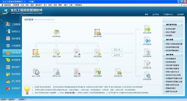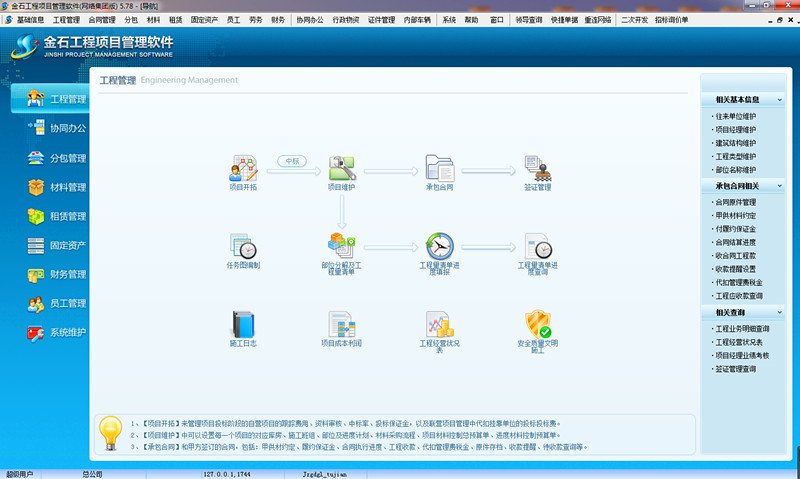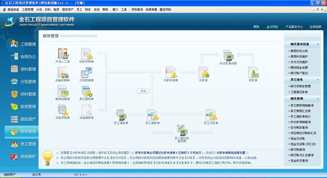 本軟件是金石軟件公司以眾多施工企業(yè)管理現(xiàn)狀為出發(fā)點(diǎn),深入了解施工現(xiàn)場,經(jīng)過七年地不斷完善與努力,打造成為一款成熟、靈活、實(shí)用性極高的信息化內(nèi)控管理平臺。軟件以成本控制為核心,以資金管理為主線,全面解決項目管理難題,提升項目管控能力。對工程的投標(biāo)管理、中標(biāo)后的進(jìn)度管理、分包管理、采購招標(biāo)、材料管理、租賃管理、固定資產(chǎn)管理、員工管理、勞務(wù)管理、資金管理、押金管理、發(fā)票管理、稅金核算、聯(lián)營管理、文檔資料管理、物資管理、安全質(zhì)量管理、證件管理、車輛管理、工程結(jié)算、等進(jìn)行全方位管理,并提供強(qiáng)大的OA功能,能夠?qū)崿F(xiàn)各部門之間的數(shù)據(jù)共享及業(yè)務(wù)單據(jù)網(wǎng)上簽批審核。并且提供了強(qiáng)大的自定義工作流驅(qū)動和各種流程開關(guān),企業(yè)可根據(jù)自己情況自行設(shè)定,從而規(guī)范企業(yè)管理、讓工作流程正歸化、簡單化。通過工作流,讓信息送審、審批更貼近日常公司管理模式,申請人可隨時看到當(dāng)前業(yè)務(wù)的審批進(jìn)度和各領(lǐng)導(dǎo)的審批意見。