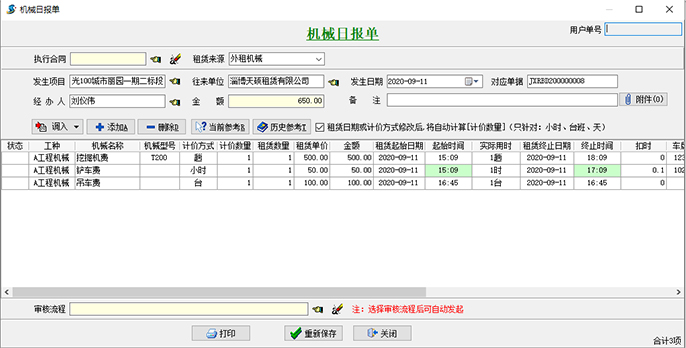 1、項目部新建【機(jī)械日報單】單據(jù),其中計價數(shù)量(工作時長)可根據(jù)起始時間和終止時間自動計算。