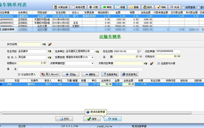 該單據(jù)是工程管理系統(tǒng)中車輛管理的基礎憑證,單據(jù)內(nèi)部的數(shù)據(jù),會對【工程成本】、【應付賬款查詢】、【供應商應付賬款匯總查詢】、【運輸車輛匯總表】這幾個模塊產(chǎn)生影響。