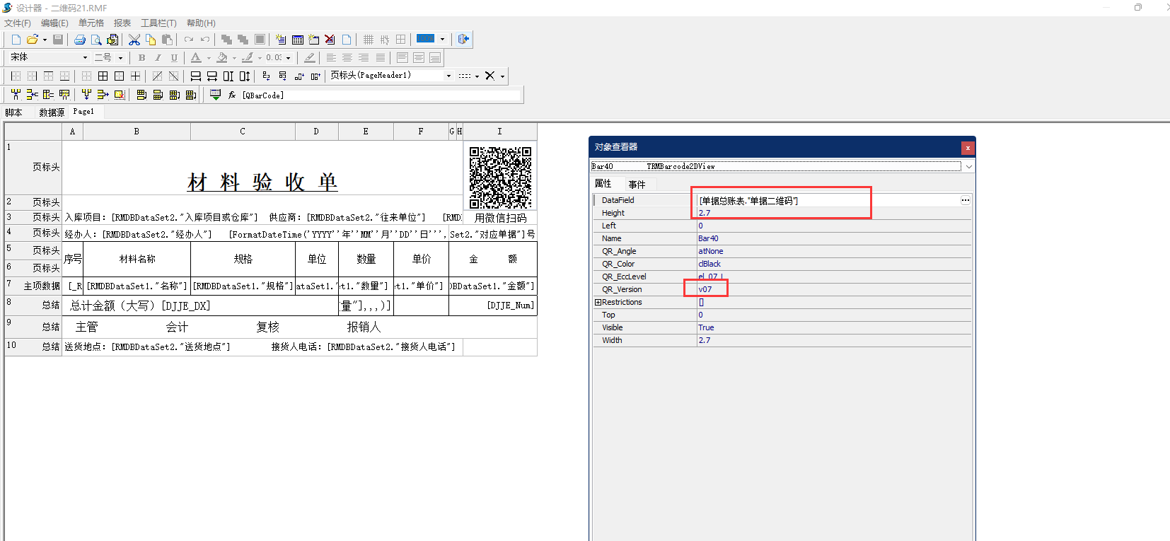 3、設置好二維碼樣式之后右鍵點擊單元格,點擊屬性。設置字符來源(datafield)為“[單據(jù)總賬表."單據(jù)二維碼"]”,二維碼版本(QR_vesion)為:v07