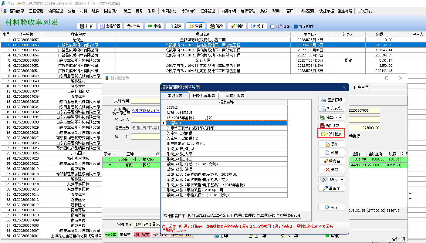 1、打開材料驗收單列表,找到單據(jù)點擊查看后點擊打印按鈕。找到常用報表點擊設計報表。