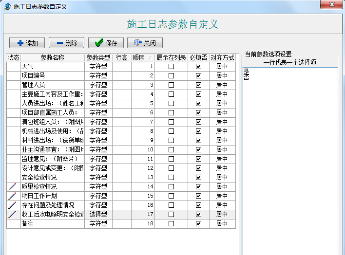 ①點(diǎn)“添加”按鍵增加豎列; ②在“參數(shù)名稱(chēng)”列輸入需要的內(nèi)容; ③“參數(shù)類(lèi)型”列選擇類(lèi)型,其中“字符型”可輸入文字和數(shù)值、 “選擇型”可以如下圖中顯示一行代表一個(gè)選擇項(xiàng),只可選擇不能輸入 、“數(shù)值型”只能輸入數(shù)值,不能輸入文字內(nèi)容 、 “布爾型”則是勾選選擇型; ④“順序”列調(diào)整自定義項(xiàng)的先后排序 。