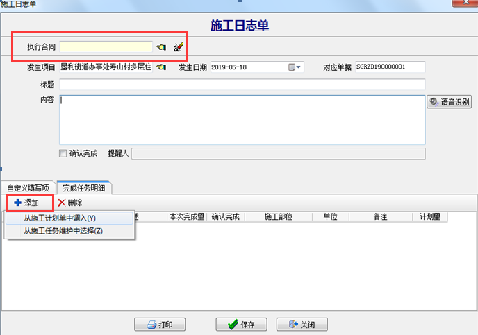2、點(diǎn)“添加”可以從“施工計(jì)劃單”或“施工任務(wù)維護(hù)”中調(diào)入并填報(bào)完成量