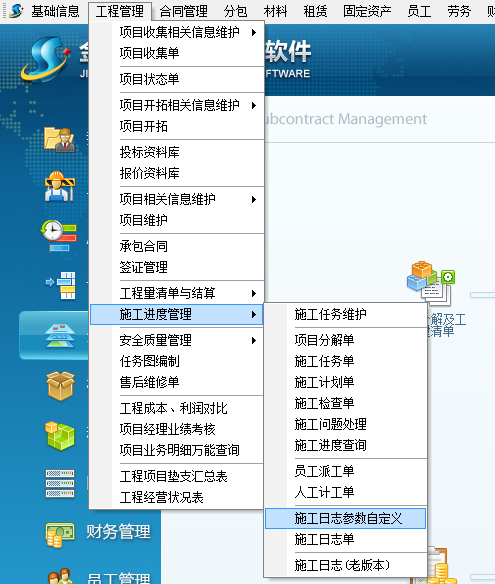 二、工程項(xiàng)目管理軟件施工日志自定義:菜單欄 “工程管理模塊”→“施工進(jìn)度管理” →“施工日志參數(shù)自定義”