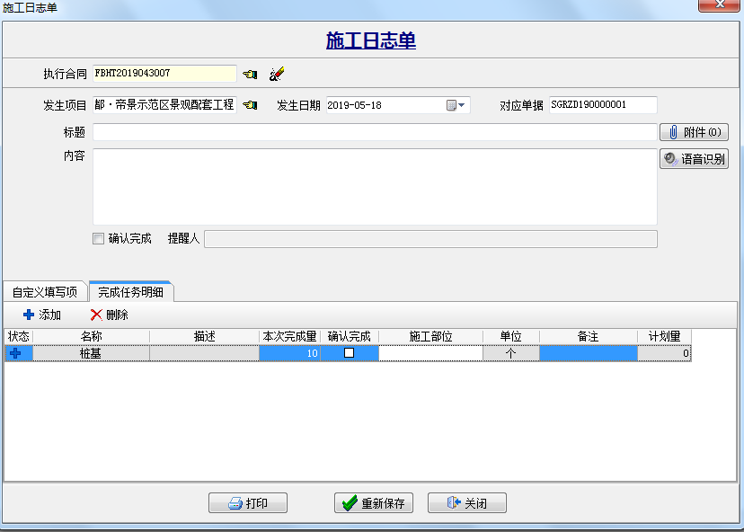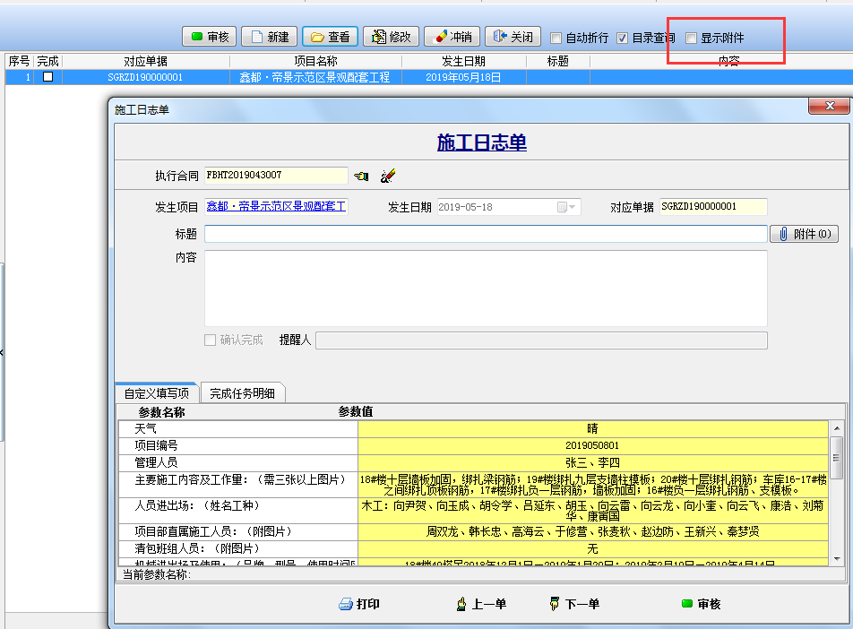 三、填報(bào)“施工日志單”根據(jù)自定義的字段 輸入相對(duì)應(yīng)的內(nèi)容,點(diǎn)下圖中的“顯示附件”添加施工現(xiàn)場(chǎng)的圖片。