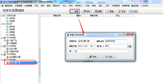 進(jìn)入系統(tǒng)的“項(xiàng)目管理”模塊,點(diǎn)擊“項(xiàng)目任務(wù)圖編制”,點(diǎn)擊“新建”按鈕保存,(便于后期進(jìn)行工程項(xiàng)目施工進(jìn)度的管理)如圖: