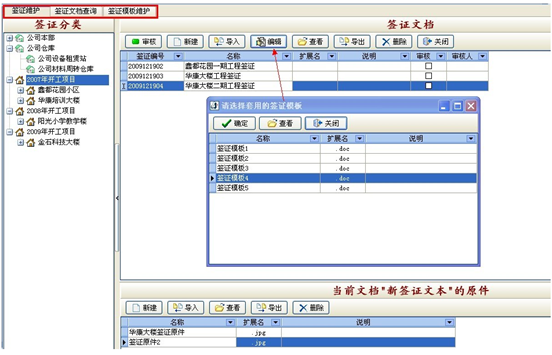 操作方法:在窗口左側(cè)選擇要做簽證的項(xiàng)目,在右側(cè)窗口點(diǎn)擊“新建”按鈕,輸入名稱后,點(diǎn)“編輯”按鈕,選擇一個(gè)簽證模板后,即可開始編輯簽證文檔。