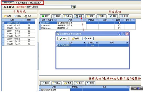 A添加施工日志:首先選擇項(xiàng)目名稱,在“日期列表”下點(diǎn)“添加”按鈕,選擇日期。然后在右側(cè)的“日志文檔”下新建一個(gè)日志文檔,然后選擇“編輯”按鈕,選擇一個(gè)“日志模板”建立日志文件可記錄工程項(xiàng)目施工進(jìn)度。也可以直接導(dǎo)入已寫好的現(xiàn)成日志文檔到軟件中,或者將 寫在日記本的日志用數(shù)碼相機(jī)或掃描儀做成圖片格式直接導(dǎo)入到軟件中。