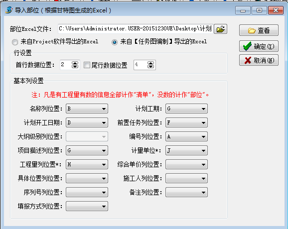 上圖為來自project軟件導(dǎo)出的excel格式。在進(jìn)度管理中導(dǎo)入時(shí)選擇好本地excel文件,設(shè)置好首行尾行數(shù)據(jù)位置,選擇好對(duì)應(yīng)excel表中各列位置,即可選擇確定導(dǎo)入,如下圖: