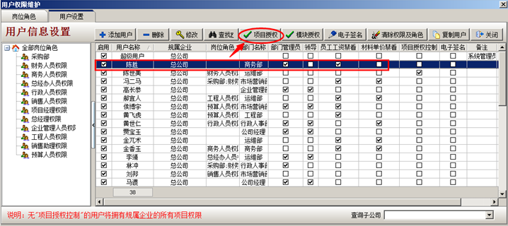 然后陳勝的項(xiàng)目授權(quán),登錄超級(jí)用戶----系統(tǒng)維護(hù)----打開用戶管理權(quán)限設(shè)置,選中陳勝,設(shè)置項(xiàng)目授權(quán)