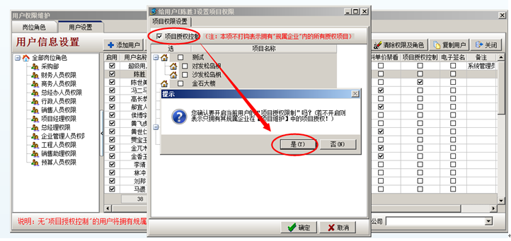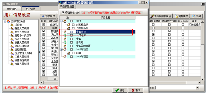 彈出設(shè)置項(xiàng)目授權(quán),以陳勝只有金石大樓這個(gè)項(xiàng)目的權(quán)限進(jìn)行項(xiàng)目授權(quán)