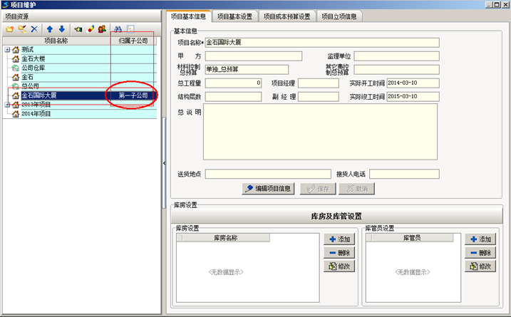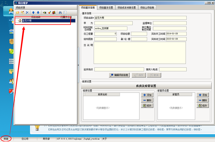 工程管理軟件中設(shè)置完成之后,重新登錄陳勝的賬戶,查看該員工的項(xiàng)目權(quán)限,項(xiàng)目維護(hù)中顯示的項(xiàng)目只有金石大樓這個(gè)項(xiàng)目