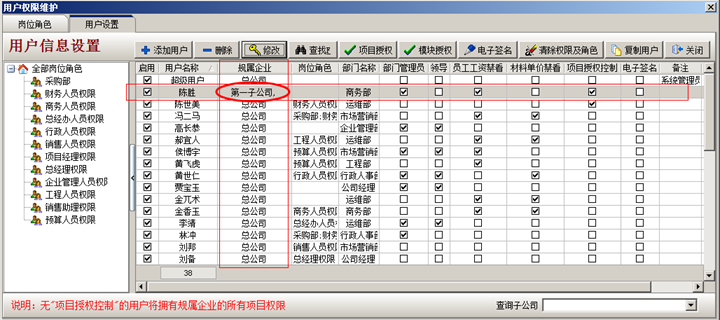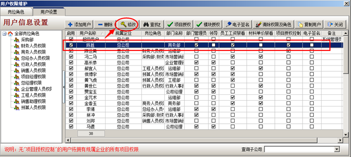 3.工程管理軟件中設(shè)置子公司員工:以員工陳勝為例講解,登錄超級(jí)用戶----系統(tǒng)維護(hù)----用戶管理權(quán)限設(shè)置。選中員工陳勝,點(diǎn)修改按鈕